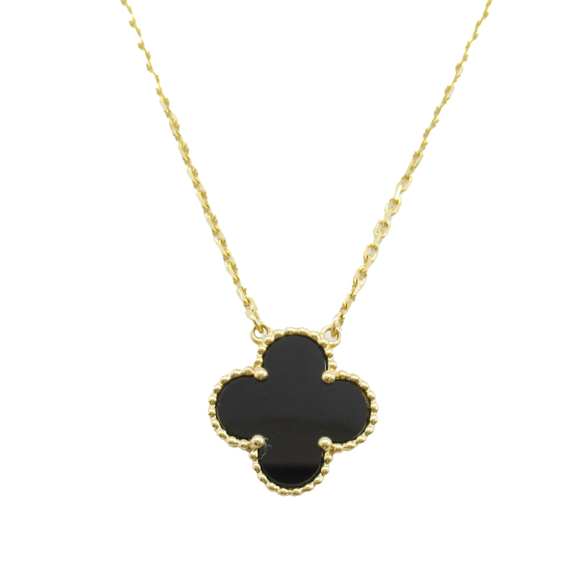 This Necklace features an 18k Yellow Gold body, an Onyx Alhambra pendant, and a lobster clasp closure.